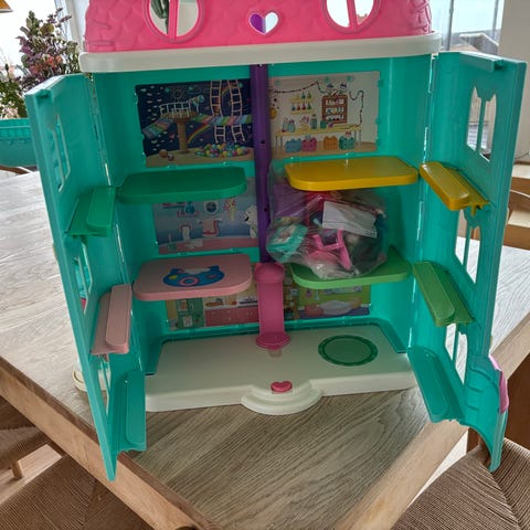 Hiv i poten, så drejer 2 skiver rundt; den med figurerne, og den med bilen.