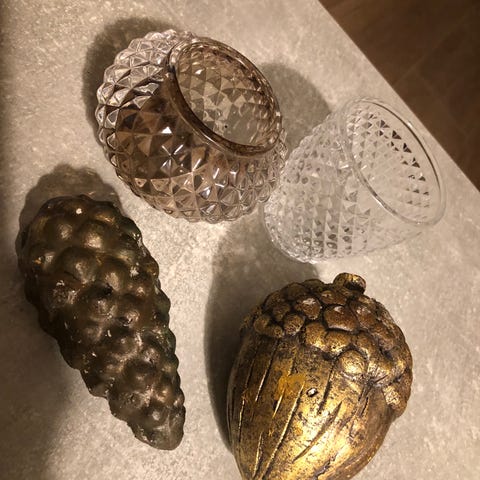 Forgyldte kogler til dekoration eller pynt, 3 gyldne kogler i porcelæn.