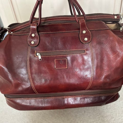 Rejsetaske m/hjul, Luca Vergani, b: 45 l: 25100 h: 65, Mørkeblå rejsetaske med 2 hjul. Med brune kunstlæder besætninger. 2 store lommer foran. Teleskopstang.