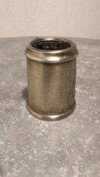 Tin, Tinkrus, Lille tinkrus (H=7,5cm) med skibsmotiv (måske vikingeskib) sælges, men kun til pynt pga. utæt bund.