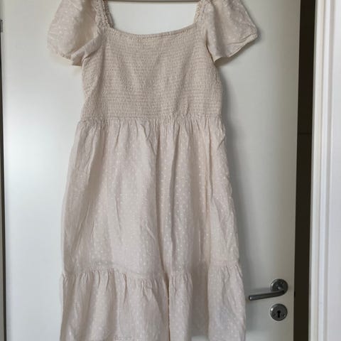 Super sød mørkeblå og hvid, stribet kjole i polyester, viskose og elastan. Måler ca. 110 tværs over fra armhule til armhule og 88 cm i længden. Brugt og lidt fnulder. Sender gerne
