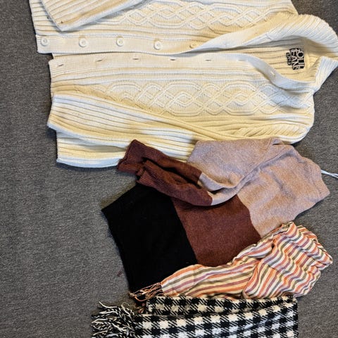 Kjoler. 2 vinterjakker. Bukser. Skjorter. Bluser. Trøjer.