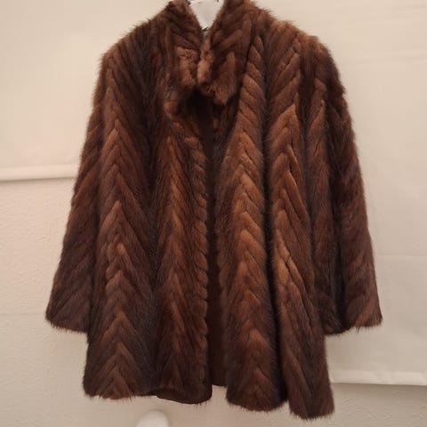 frakke brun str. S/ jeg er en str. 44/ løs pasform. Passer mig.