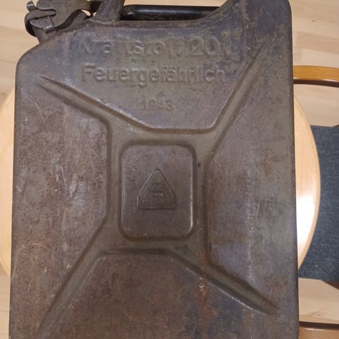 Militær, Benzin beholder, Svensk ca. 30 L benzin beholder fra (krigs/beredskabslageret) antagelig fra omkring 1930 se messing skiltet. Senere overtaget af et firma "Lindblad" i Esløv (hvem det så end var) Forskrunings proppen mangler og der er en bule (ses under det ene skilt) kan dog rettes ud