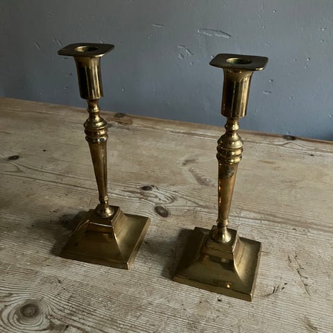 Lysestager, Lombard, 2 gedigne engelske messingstager fra så’n ca. deromkring 50’erne. Samlet pris