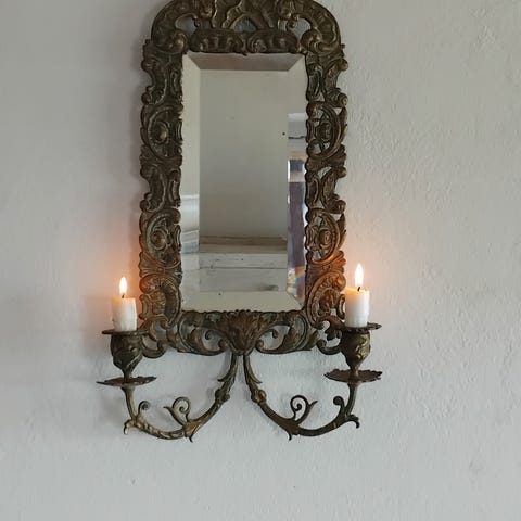 Antik bordspejl, Antik massivt messing bordspejl med faset slebet glas. Det er et vippe spejl. Holder til smykker og lignende i bunden. Mange flotte detaljer. Højde 33 cm. Længde 25 cm. Pris 1200 kr. Se også mine andre annoncer. Hv123