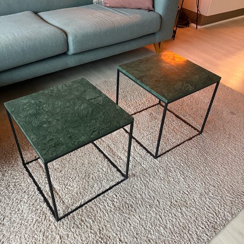 Hjørnebord fra Ilva glas på toppen og med marmor ben.