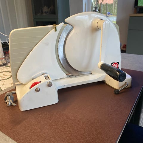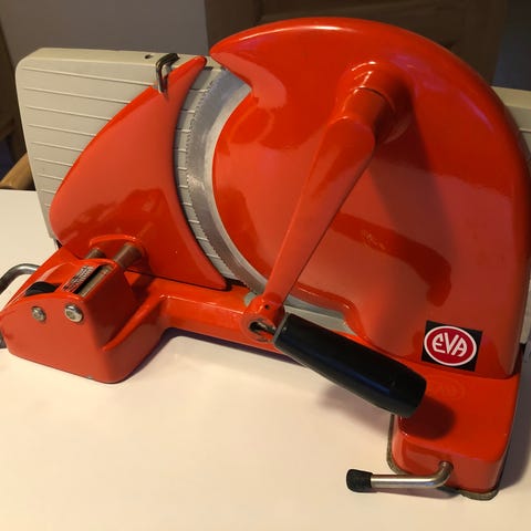 Pålægsskærer, Eva, Pålægs- brød skærer sælges fra ikke ryger hjem. Fylder ikke meget når den er foldet sammen 35x 9,5 x 19 cm. Ikke meget brugt.