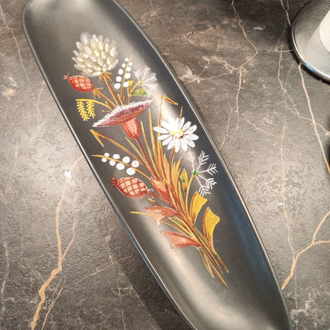 Keramik, Retrofad, Ravnild, Håndmalet fad fra slutningen af 1960'erne. Fremstillet af den fynske producent Ravnild ved Ringe. Måler 19 x 16 cm . Flot stand uden skader og med original label fra producenten under bunden. Står på Mols men kan gratis leveres i Aarhus og Ebeltoft eller sendes billigt med GLS på købers regning