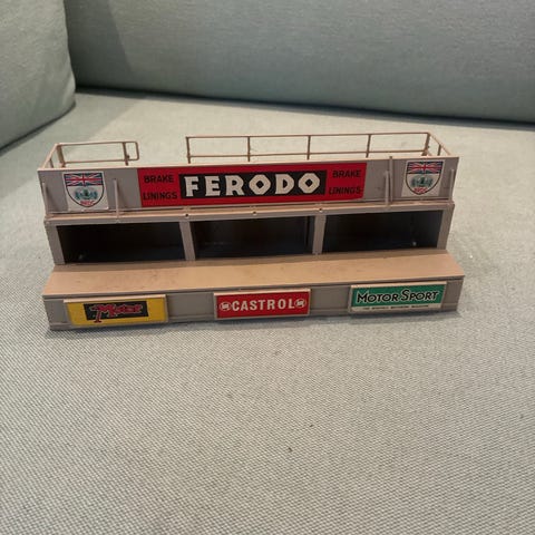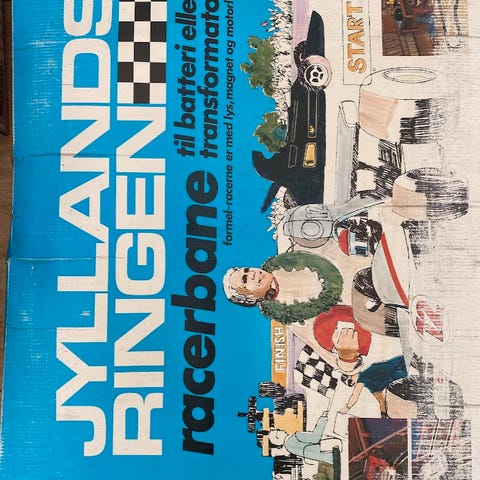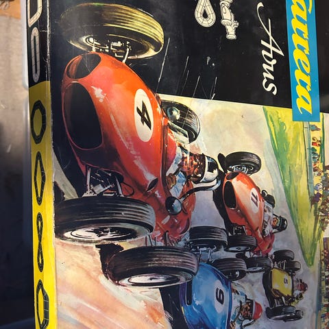 Racerbane, Scarlectric Div., 7 sæt baner + 2 kasser m. skinner + div. Biler m.m. Det meste er af ældre dato og made in England