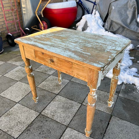 søjlebord (pris 500) , meget stabilt.Malet i samme farve som køkkenskapet.Også herses treets struktur tydeligt igen malingen.Begge møbler leveres med extra maling for fremtidige udbedringer. målet er her diameter 89 cm og højde 82 cn