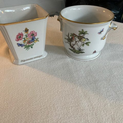 Tysk urtepotteskjuler med guldhanke og fødder inden motiv.