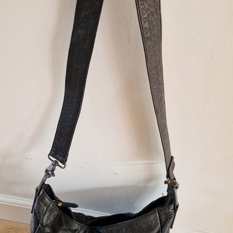 Metallænke til at have den over skulder. Lavet af kunsstof i lysgrå med rynkeeffekt foran.
