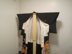 Andre samleobjekter, Kimono japansk antik, Sjælden antik håndsyet japansk kimono i ægte sort silke med håndmalet motiv.