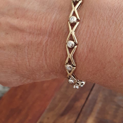 Den er i hvidguld og diamanter, jeg har haft den på få gange, Den passer med forlovelses ring. Perfekt gave til Jul. Armbånd er 12 gram,og 20 cm L