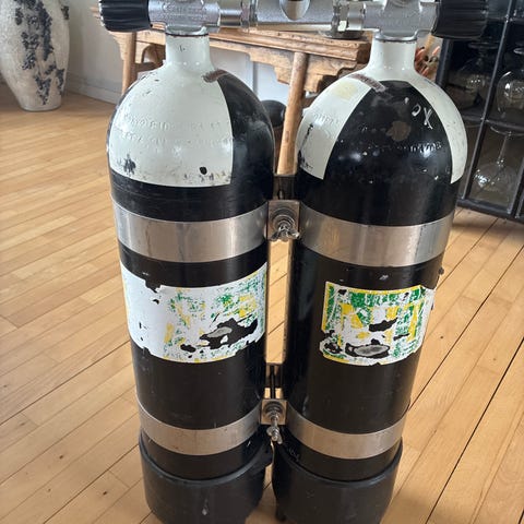 Dobbelt 10 Faber, Har dette lækre dobbelt 10 til dykning. Trykprøvet Februar 2023 og renset indvendig. Manifold og ventiler serviceret med nye pakning ( klar til 100% O² hvis man har lyst). Står med luft så lige klar til at hoppe i vandet.