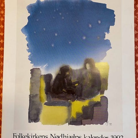 Akvarel, Dronning Margrethe, motiv: Bibelske motiver, b: 29,5 h: 42, Emne: Kalender. Folkekirkens Nødhjælp 1993.