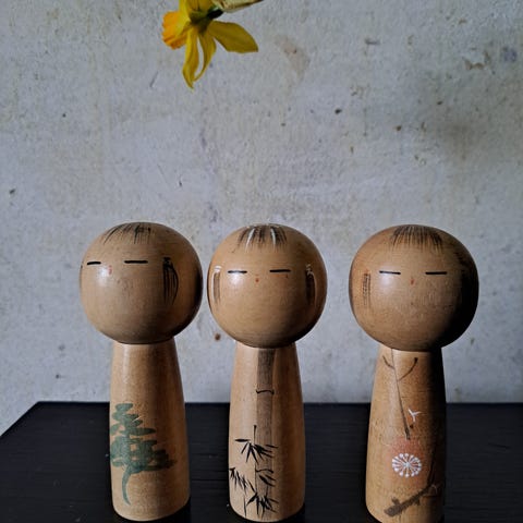 2 søde små japanske vinter kokeshi med snesko og vinterdække. H: 3,5 cm.