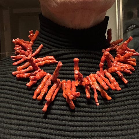 Halskæde, halvædelsten, Usædvanligt halssmykke, forsølvet med rosenquartz, blå og grøn turkis, agat, med træperler, lucite og kæder.