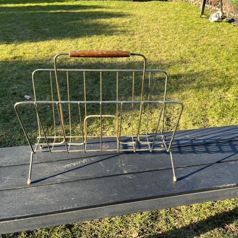Magasin holder, Super fin magasin holder fra 60’erne i smukt egetræ og ruskind. Trænger til en kærlig hånd men er i rigtig fin stand.
