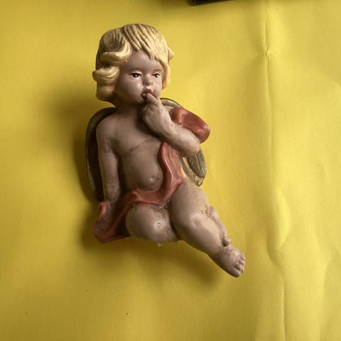 Engel, Lille enger med gennemsigtige vinger, stående i sølvfarvet rose. 11 cm høj. (1543)