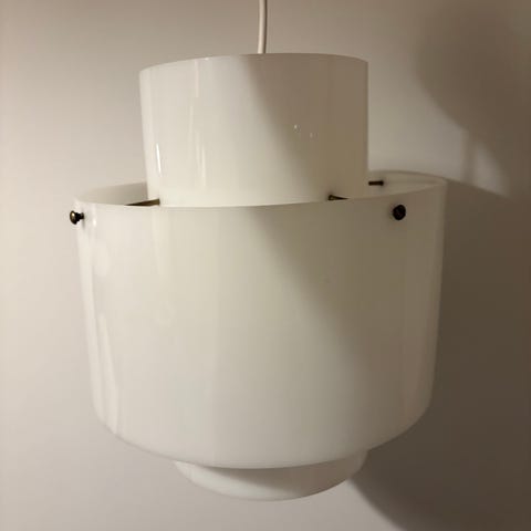 Jens Møller Jensen, Louis Poulsen, Albertslund, pendel, Louis Poulsen Albertslund pendel designet af Jens Møller Jensen. Sjælden og flot pendel designet i 1960erne. Fremstillet i hvidmalet aluminium og klart glas. Fin stand og har hængt samme sted indendørs siden den blev købt i 1988. Ring til Christian på 26737477.
