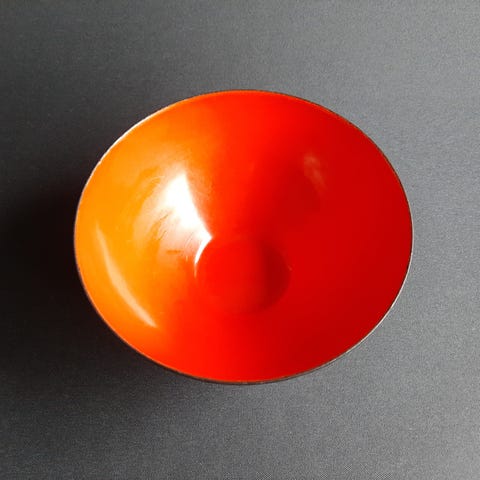 Det er den store på 25 cm. I diameter. Orange emalje indvendig uden afslag. Sort udvendig, med meget lille afslag. Et stykke Dansk design, der aldrig går af mode. Hentes i Søborg.