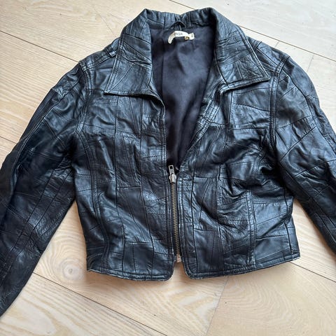 Med skrå lynlås, pyntelommer og firkantet sølvnitter i hals og ærmer.