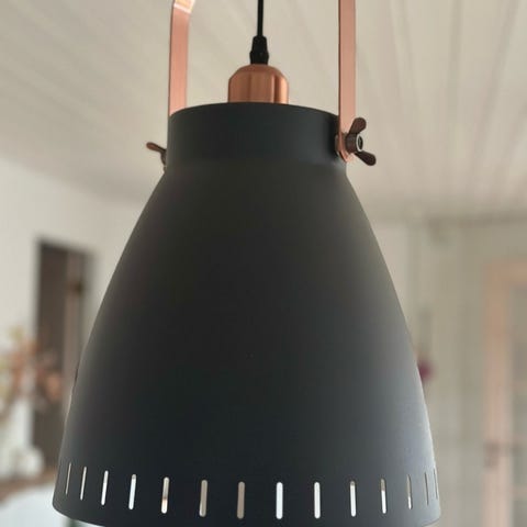 Pendel, H & M Focus, Brugt med slidspor. Ø 38 cm. Inkl. akrylskærm så lampen ikke blænder. Porselæn fatning.