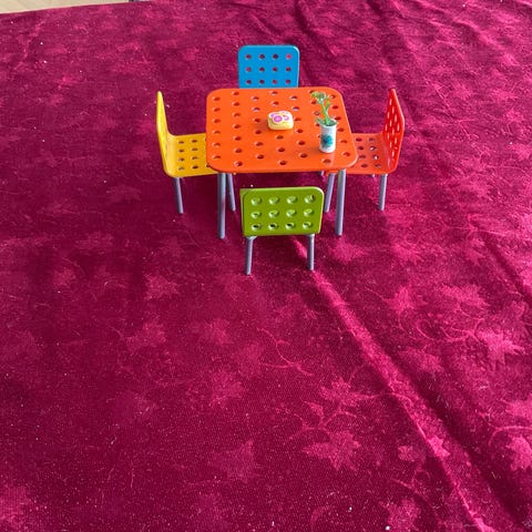Dette er Lundbys originale havemøbler tilhørende Carolines Home 'HIPPO huset'. Møblerne er lavet/støbt i Modella forme, efter at Lundby opkøbte den tyske Plasty fabrik i 1984, i pink, blåt og hvidt plastik.]