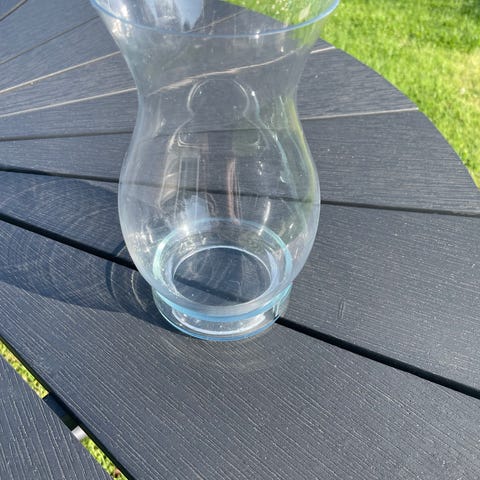 En Hurricane med tørrede roser. Højde 15 cm og diameter øverste kant 11 cm. Passer til et bloklys på Ø 8 cm. Kan også bruges som vase eller brugskunst.