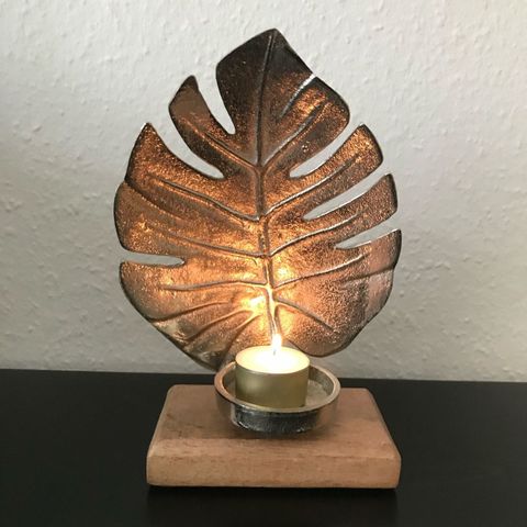 Fyrfadslysstage med blad dekoration fra Gilde. Lavet af træ og aluminium.