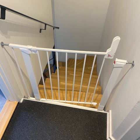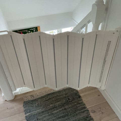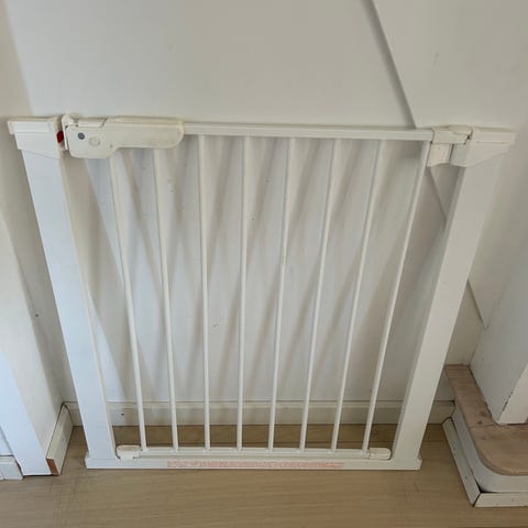 Trappegitter, Gitter til døråbning, Babydan, Gitter til dør eller trappe. Kan reguleres i bredden. Sælges billigt, da udløser fjeder mangler, men det har ingen betydning for virkningen.