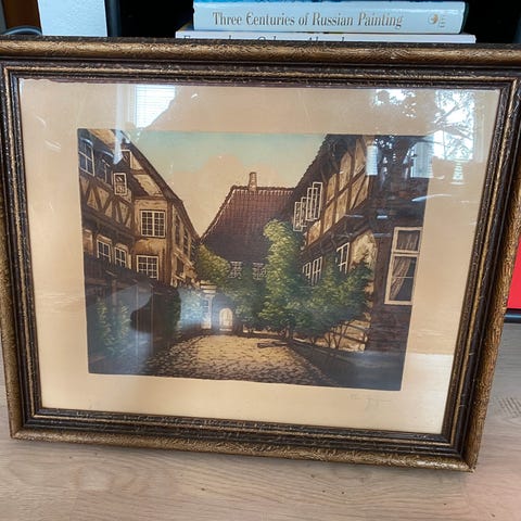 Tuschtegning-signeret og dateret 10/9-1934, Thorvald Hansen, motiv: Bogense Kirke, b: 48 h: 62, smukt billede i fejlfri eksklusiv, gammel ramme med glas for.Rammen alene er pengene værd!