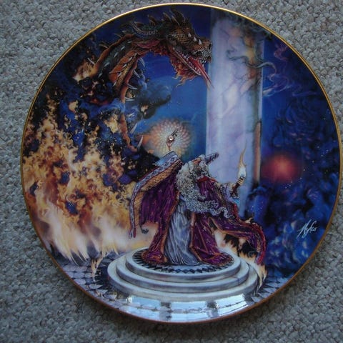 Platte, Franklin Mint, Flot Royal Doulton platte fra Franklin Mint. Platten har et dragemotiv og er fantastisk livagtigt og detaljeret. På platten sidder der en lille diamant. Med platten medfølger der et ægthedscertifikat og sælges med bordholder og vægophæng.
