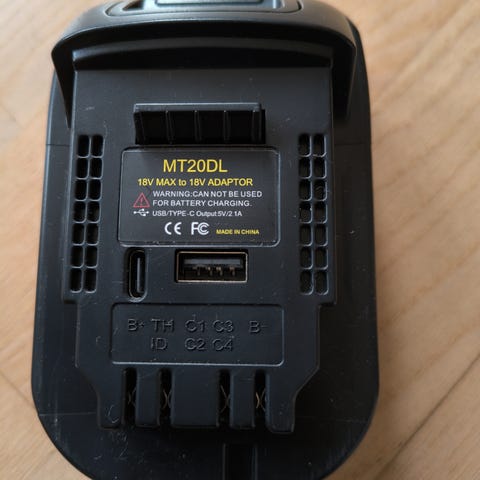 Tilbehør til elværktøj, DeWalt Makita, Batteriadapter så man kan bruge DeWalt batterier på værktøjet fra Makita.