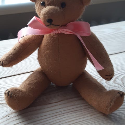 Blandede hobbyartikler, En bamse, samt 3 x hobby m bamser, En bamse måler ca 17 cm i hj. Pris 33 kr.