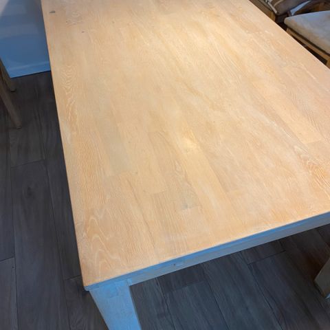 Spisebord m/stole, Massiv eg, b: 100 l: 220, Vi sælger vores spisebord i egetræ, der er 2x tillægsplader a 45cm så den kan forlænges med 90cm og dermed total længde 310cm.