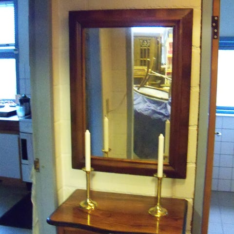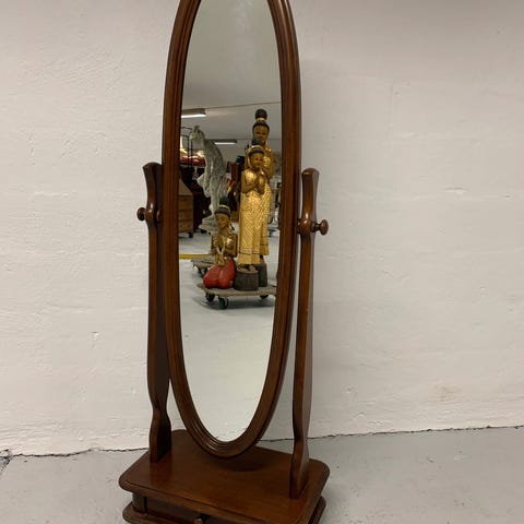 Spejl og bord med skuffe, Matchende sæt bord (35x49 - 68 højt) og spejl (40x85) i mahogni finer.