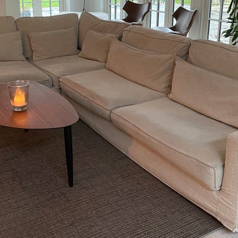Sofaen har fyld af koldskum med en top af dun og silikonefibre. Der medfølger lændepuder.