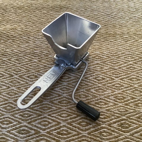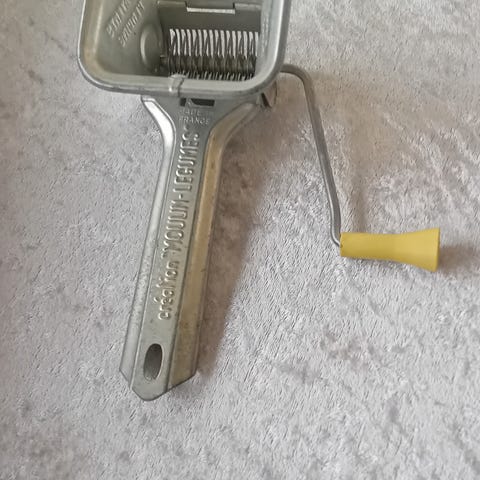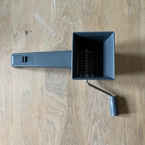 Persille hakker - NEM. God gammel persille hakker i alu med teaktræs håndtag mærket. Måler 7 x 6 x 5 cm. Super god brugbar stand.