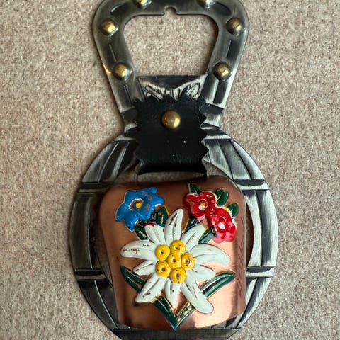 Oplukker og klokke, i messing, Højde 11 cm. Bimler fint.