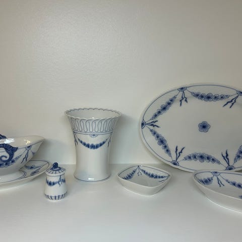 Det smukkeste porcelæn fra Bing & Grøndahl i stellet Empire med skællet mønster og guirlander af blå blomster.