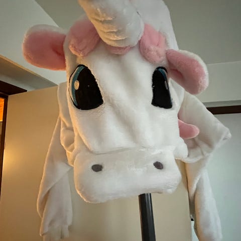 Enhjørningen kostume str 140, Sød enhjørning med horn, vinger og hale. Brugt få gange, men kunne godt bruge en strigle på den hvide pels....