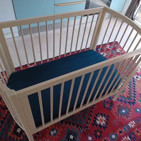 Tremmeseng, b: 60 l: 120, Meget flot og velholdt tremmeseng i kirsebærfarvet træ. Den ene side kan hæves og sænkes, incl. madras fra BabyDan.