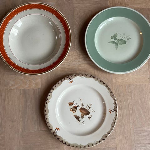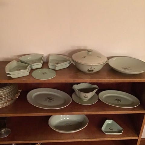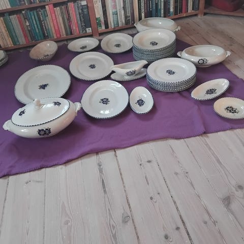 Porcelæn, Spisestel, Aluminia, Saltholm, Aluminia, Saltholm, lysegrønt stel med sølvfarvet dekoration.