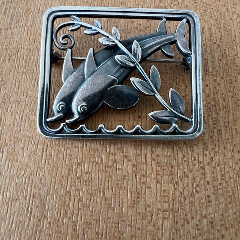 Broche, Georg Jensen delfin broche nr. 317 udført i sterlingsølv. Måler ca. 4,1 cm i længden og 2,1 cm i højden. Designet af Arno Malinowski.
