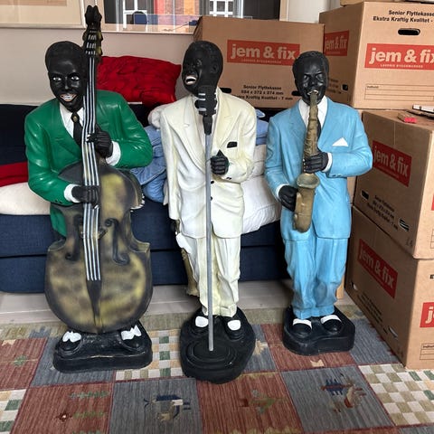 Andre samleobjekter, Jazzfigurer, Julegaveide til jazzelskeren-Skønt Jazzorkester med 5 aktører-trommeslager,bassist,saxofon,guitar og sangerinde-perfekt stand(højde 7 cm)
