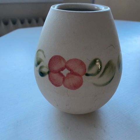 Sandfarvet mat keramikvase dekoreret med klokkeblomster i glasur.