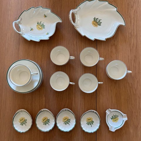 kaffestel fremstår uden skår, enkelte kopper med slidt guldkant.